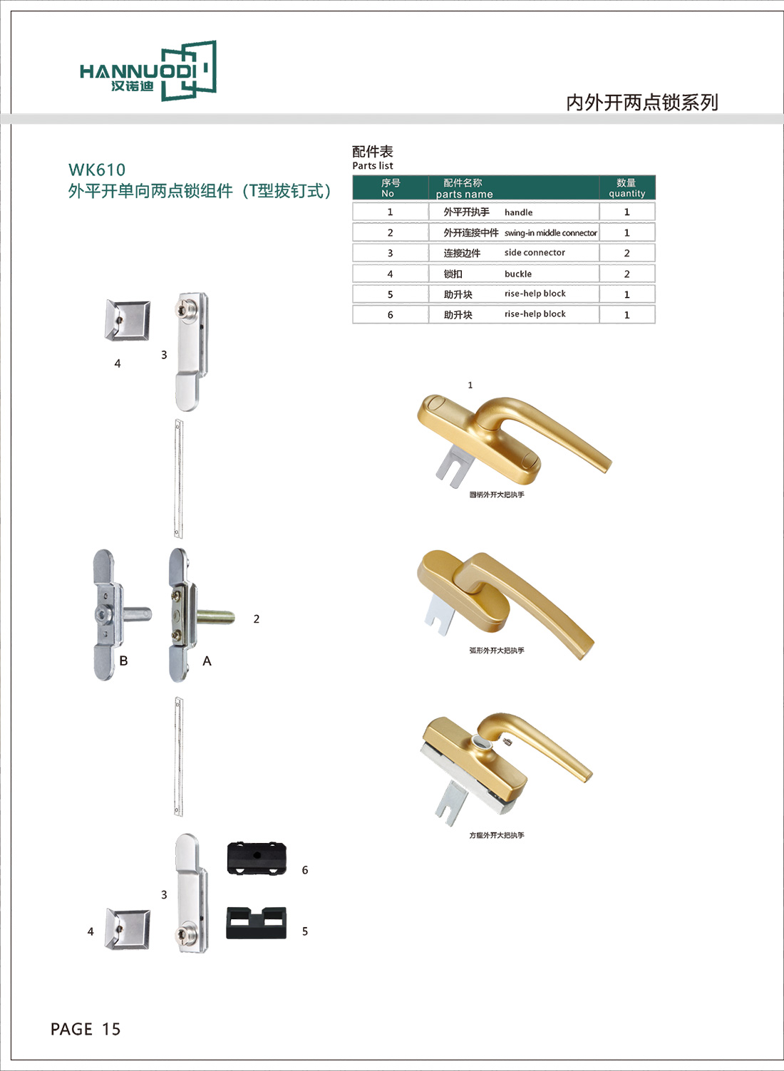 WK610外平開單向兩點鎖組件(T型拔釘式):